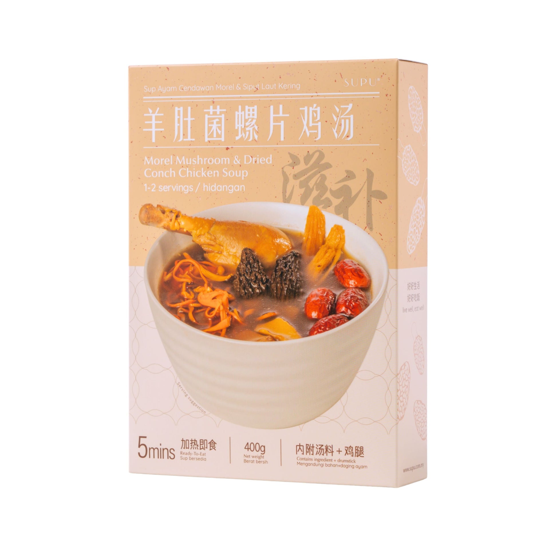 • 羊肚菌螺片鸡汤 Moral Mushroom & Dried Conch Chicken Soup (含有药材)